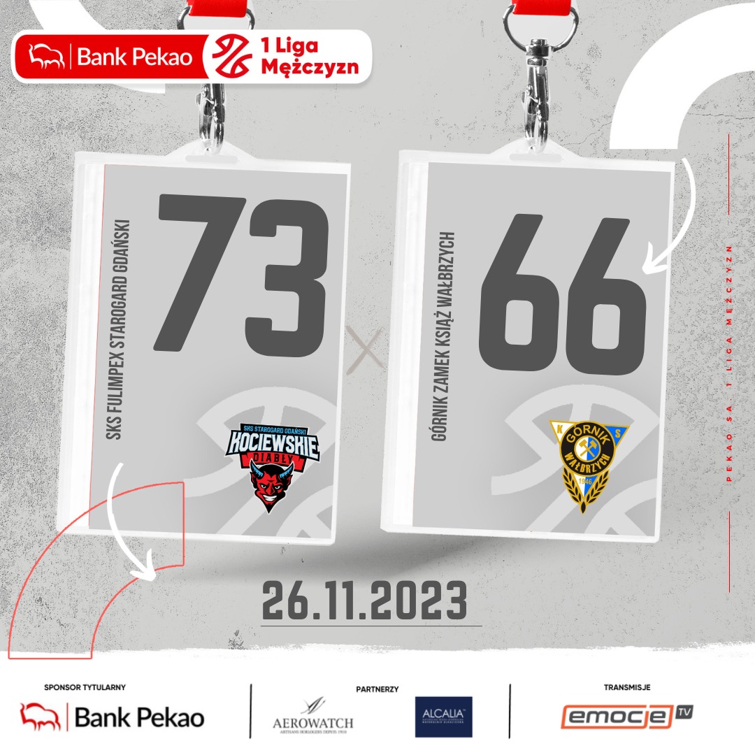 SKS Fulimpex Starogard Gdański lepszy od Górnika Zamek Książ Wałbrzych w hicie 12. kolejki Pekao S.A. 1 Ligi Mężczyzn. Kociewskie Diabły zwyciężyły 73:66, dobrze prezentując się zwłaszcza po przerwie. Jednym z wyróżniających się graczy gospodarzy był Adrian Kordalski, który poprzedni sezon spędził pod Chełmcem.