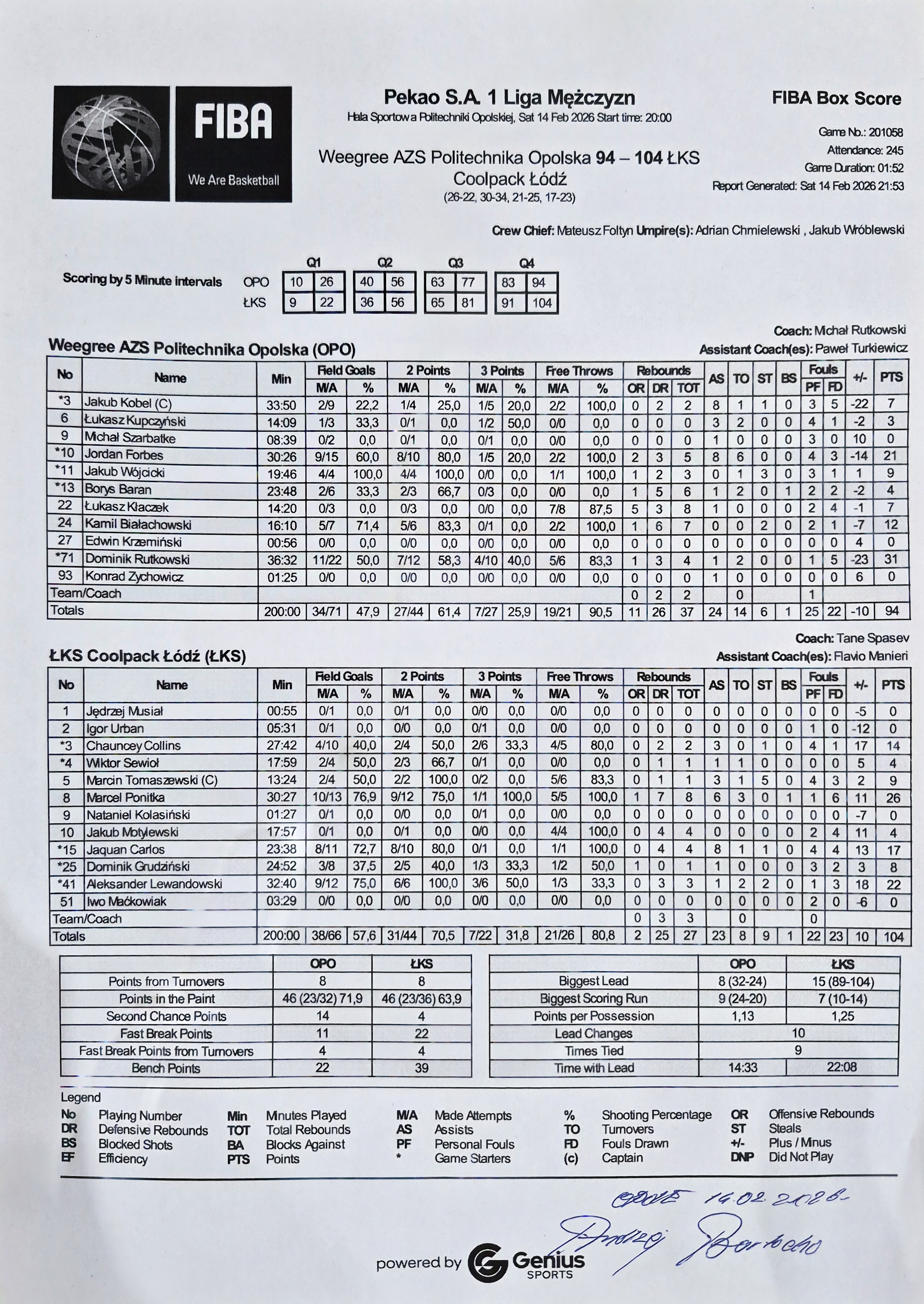 | 24 | Kamil Białachowski | 12 | 16:10 | 5/6 | 83.3 | 0/1 | 0.0 | 5/7 | 71.4 | 2/2 | 100.0 | 1 | 6 | 7 |   | 2 | 1 |   | 2 |   |   | 19 | -7 | |